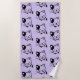 Ein gemustertes Strandtuch, das eine lächelnde und schwingende Kätzin mit einem schwarzen Fleck um sein Ohr illustriert. Lila Hintergrund. Einfach niedlich und hübsch.