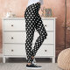 Niedliche Leggings mit einem kleinen, weißen Herzmuster auf schwarzem Hintergrund. Eine stilvolle monochrome Ergänzung zu Ihrem Kleiderschrank.