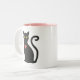 Elegante schwarze Katze und rosa Herz Kaffee Tasse. Schwarze Katzen sind zart und süß!