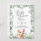Schöne Babydusche mit einem bezaubernden Babypiglet, umgeben von Aquarell und Blumenbeeten. Hübsche handgeschriebene Schrift für Baby Shower ist perfekt für diese genderneutrale Einladung. Koordination zurück. Sehen Sie die Koordination der Artikel in unserem Shop, Verzauberte Finch.