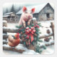 Weihnachtsticker. Hübsche Aquarellbilder eines Schweins und Hühners auf einem Bauernhof an einem schneebedeckten Tag.