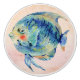 Niedliche schöne Aquarellmalerei von einem kleinen niedlichen blauen Ozeanfisch, Schwimmen und Spielen im Meerwasser. Das ist eine der nautischen Hintergründe für die Dekoration Ihres Strandhauses, die Ihren Raum mit seinen hellen Farben in Blau, Rosa und Gelb lebendig und reizvoll erscheinen lässt.