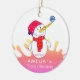 Niedliches Snowman Baby's First Christmas Keramik Ornament. Niedlich lächelnder Schneemann mit einer Schneeflocke auf der Nase. Der Hintergrund ist eine farbenfrohe Regenbogenfarbe mit weißen Schneeflocken. Einfach personalisieren mit Ihrem Namen und Geburtsjahr.