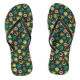 Gemusterte Flip-Flops aus St. Patrick's Day in festlich grün, orange, gelb und schwarz, mit einem lustigen, verrückten Muster vierblättriges Kleeblatt Kleeblatts, glücklichen Hufeisen, Kobobolden, grünem Bier und orangefarbenen irischen Küssen. Ein perfektes Kompliment für Ihr Bier bei St Paddy's Day Paraden und Partys!