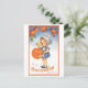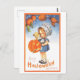 Diese Postkarte ist eine Reproduktion einer Vintagen Halloween-Postkarte, die ein niedliches Mädchen mit ihrem Welpen und einer Jack-o-Laterne zeigt.