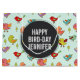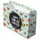 Geburtstagsgeschenk Tasche, groß. Entworfen mit einem Muster von von Hand gezeichnet whimsical Vögeln. Niedliche grüne Kiefernbäume dazwischen. Ein schwarzer Kreis oben, vorne, mit dem personalisierten Text innen.