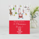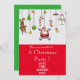 Eine Party Einladung für ein Weihnachtsfest-Party mit einer niedlichen Abbildung des Cartoon Weihnachtsbaumdekorationen mit Rentieren und Weihnachtsbaumdekorationen, die in einer Reihe hängen. Der Text und die rote Hintergrundfarbe auf dieser Einladung sind vollständig anpassbar, um Ihre persönlichen Daten einzubeziehen.