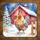 Niedlicher Untersetzer mit einem Hähnchen im Aquarellstil, stehend von einem rustikalen Holzzaun vor einer Scheune.