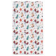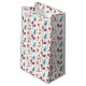 Niedliche Weihnachtsgeschenktüte mit einem wiederholten Muster von grünen Weihnachtsbäumen, warmen Wollfäusten, niedlichen Strümpfen und roten Bausteinen auf weißem Hintergrund.