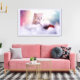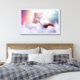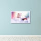 Leinwand Wandkunst mit einem Foto eines Ingwer Kätzchens, das auf einer weichen, weißen und roten Weihnachtsmannmütze sitzt. Unscharfe glitzernde Lichter auf beide Seiten.
