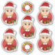 Set von sieben Vinyl-Aufklebern mit einer Illustration eines niedlichen, kleinen, glücklichen Lächelns mit kurzem blonden Haar, der in Weihnachtskleider gekleidet ist und einen roten Weihnachtshut trägt; fünf Aufkleber des Mädchens und zwei Aufkleber mit einem Weihnachtskranz; mit einer anpassbaren Textvorlage für Ihren Namen oder Ihre Nachricht.