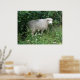 Dieses schöne Bild zeigt ein Foto eines niedlichen flauschigen Schafes. Die Schafe sind von wilden Blume und langen Gras umgeben und essen einige Blätter. Es hat einen dicken weißen Wollmantel und eine niedliche schwarze Nase.