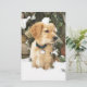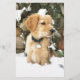 niedlicher, goldgelber Retriever im Schnee gegen Felswand mit Efeu