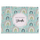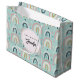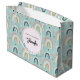 Eine Geburtstagsgeschenktasche mit einem bezaubernden Muster. Farbenfrohe Regenbögen in rosa, blau und grün. Kleine Herzen und Kreise fügen eine Touch von Launen hinzu. Niedliche Weiblichkeit und Spaß.