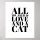 Niedliche schwarz-weiße Typografie zitieren. Alles, was du brauchst, ist Liebe und Katze. Niedliches Geschenk für Freunde und Familie.