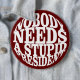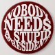 Das Motiv auf dem Element zeigt einen weißen Hintergrund mit schwarzem, fett formatiertem Text in Hauptstädte. Der Text lautet: "NIEMAND BRAUCHT EINEN STUPID PRÄSIDENTEN" Das Design ist einfach und direkt, mit einem starken, blockierten Schriftart, der die Botschaft klar vermittelt.