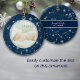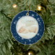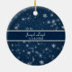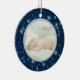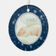 Hier ist ein elegantes Holiday-Ornament, das Ihr eigenes Foto in einem glänzenden runden Imitat Diamantrahmen zeigt. Der Rahmen ist auf einem dunkelblauen Nachthimmel mit weißen Schneeflocken und Sternen verziert. Die Rückseite des Ornaments hat den gleichen Hintergrund, mit Ihrem eigenen Text in Weiß auf einem passenden blauen Banner, der mit einem Imitat-Diamantrand ausgekleidet ist. Ein funkelndes Sake-Ornament zum Gedenken an das erste Weihnachtsfest Ihres Babys!