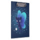A whimsical illustration of a fairy-like fantasy creature that resembles a cat with colorful butterfly wings. The kitten is hovering in place holding a small star shaped lantern in its front paw.