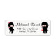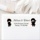 Ein hübscher kleiner, schwarzer Ninja-Junge errötet schüchtern, während er ein Origami-Papierherz hinter seinem Rücken hält und ein niedliches Ninja-Mädchen anschaut, ebenfalls schwarz gekleidet, aber für einen rosa Bogen auf ihrem Kopf. Der Schwertgriff von Girl ist auch rosa gefärbt.