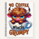 A funny and sarcastic colorful design showcases an adorable highland cow perched in an empty coffee cup. With a grumpy expression, big blue eyes, and brown fur, the cow adds a charming touch. The vibrant text reads, "No coffee much grumpy." This design is featured on a variety of products, making it a perfect gift for coffee enthusiasts.