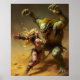 A fierce warrior woman confronts a massive, green-skinned creature in a dynamic and intense battle scene. Her flowing blonde hair and determined expression contrast sharply with the monster’s ferocious, snarling features. The background is a haze of swirling dust, adding to the dramatic tension of the encounter.