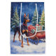 This striking Christmas painting features a confident Doberman protecting a sleigh of gifts. Strong winter visuals make this perfect for modern holiday décor and dog-enthusiast collections.