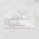 Diese Geschäftskarte kennzeichnet personalisierten Namen in der grauen modernen Skript-Schriftartart mit Geschäftsdetails in der grauen beruflichen Schriftartart auf weißem Marmorhintergrund.