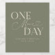 Minimalistisches Weinflaschen-Etikett für Hochzeitsessen mit Probe-Schriftzeichen, auf dem steht "noch ein Tag". Der Hintergrund ist sage grün.