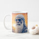 Witziges Zitat: "Noch nicht, ich bin noch nicht mit meinem Kaffee fertig." Alter Hippie- oder Bikermann mit langem Bart und Sonnenuntergang hinter ihm sieht ernsthaft aus.