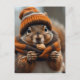 Das Design vermittelt ein Gefühl von Gemütlichkeit, Wärme und vielleicht eine Touch von Launen, sodass das Eichhörnchen auf kälteres Wetter vorbereitet ist, wenn es sich innewohnt auf den Herbst überschüttet Ernährung. Der Hintergrund ist sanft verschwommen, mit gedämpften Grüntönen und Braunen.