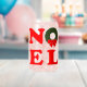 NOEL in big letters on two lines, inspired by the famous LOVE sculpture, with a Christmas wreath for the "O." For yuletide entertaining.