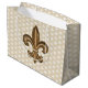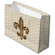Ausgeklügeltes goldenes Lilie Wappen mit weißem Lilie-Muster über Beige. Diese Geschenktasche ist ideal für eine neutrale südliche Hochzeitsgeschenktasche.