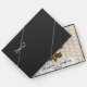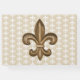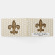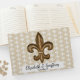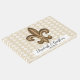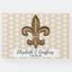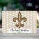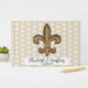 Hochzeitsgast mit einem großen goldenen Lilie-Symbol und einem kleineren weißen Lilie-Muster über einer neutralen beigen Hintergrundfarbe. Es enthält die Namen des Paares.
