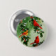 Ein Paar männlicher und weiblicher nördlicher Kardinäle stehen in einem Stollenbaum, während ein dritter Kardinal auf einem gewebten Holzkorb sitzt, der mit frisch gepflückten, heiligen Blätter und Beeren gefüllt ist. Bild erstellt aus einem originalen Ölgemälde von Crista Forest.