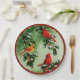 Ein Paar männlicher und weiblicher nördlicher Kardinäle stehen in einem Stollenbaum, während ein dritter Kardinal auf einem gewebten Holzkorb sitzt, der mit frisch gepflückten, heiligen Blätter und Beeren gefüllt ist. Bild erstellt aus einem originalen Ölgemälde von Crista Forest.