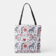Dieser farbenfrohe Totbeutel hat ein wunderschönes und aufwändiges nordisches oder skandinavisches Muster in blau grau, rot und weiß. Die Bilder beinhalten Blumendesigns, ein dekoriertes Pony, Herzen und Strichzeichnungen. Einzigartig und sehr hübsch!