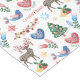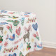 Dieses festliche Weihnachtstischtuch ist mit skandinavischen Stilbildern bedeckt, darunter ein Rentier, Musterherzen, ein Holiday Baum, Blume, Schneeflocken und vieles mehr. Die Farben sind rot, grün, gold, blau und braun. Alles ist auf einem weißen Hintergrund platziert. Einzigartig und farbenfroh!