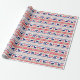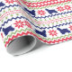 The repeated pattern on this colorful Christmas Nordic sweater style gift wrapping paper is a silhouette American Cocker Spaniel dog among snowflakes , trees, and geometric designs. Colors include navy blue, bright Holiday green, and red, all on a white background.