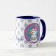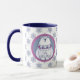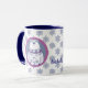 Hier ist eine niedliche personalisierte Weihnachtszeit-Tasse, die sowohl Kindern als auch Erwachsenen gefallen kann. Auf einer Seite befindet sich ein bezauberndes Schneemobild im nordischen Stil inmitten eines blau-grauen Hintergrunds, das gerahmt ist, Lavendelrosa zu verbinden. Die andere Seite hat einen Eisbären auf dem gleichen Kreisbanner. Die gerahmten Bilder werden dann auf einem passenden blauen und weißen Schneeflockenhintergrund platziert, wobei Ihr eigener Text in Marineblau zwischen den Bildern liegt.