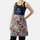 Der untere Teil dieser einzigartigen Schürze weist ein Muster bohischer Blume in Blau-, Zimtbraun- und Goldtönen auf. Das Muster wird auf einem weißen Hintergrund platziert. Der obere Teil ist massiv passend dunkelblau, mit Ihrem Monogramm in Gold und Ihrem Namen in hellblau.
