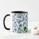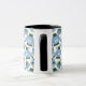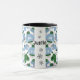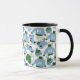 Winter-Thema Kaffee-Tasse mit einem niedlichen nordischen Muster von dicken Pullover, Hüten, Milben, Socken und skandinavischen Schneeflocken in Blautönen mit grünen Akzenten. Personalisieren Sie den Namen im einfachen Zazzle "Personalisieren"-Button.
