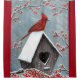 Acrylmalerei des roten NordKardinalsvogels im Winterschnee. Der Schnee fällt leicht auf ihn, den Birdhouse und die gefrorenen Stechpalmenbeeren. Ursprüngliche Acrylmalerei-Kunst durch Donna Leger. Alle Rechte vorbehalten. ©irony Entwürfe
