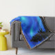 Diese digitale Grafik kennzeichnet eine Anzeige der Wirblen blauen Lichter im Nachthimmel über den Silhouetten von zwei Evergreens.