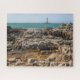 Felsküste rund um den Leuchtturm von La Hague - Genießen Sie dieses Normandie-Frankreich-Jigsaw-Puzzle mit einer der schönsten Landschaften des Landes. Reisen Sie während noch auf Zuhause! Vom Aussichtspunkt in Richtung La Hague Lighthouse in Normandie, Frankreich Schönes Leuchtturm-Puzzle Frankreich, großes Geschenk für Reisende! Foto von Claire von ZigZagRoadTrips.com