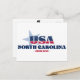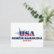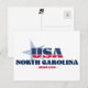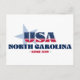 North Carolina Postcard. Ein kreatives Typografie-Design, das North Carolinas Essenz mit kühnen Rot-, Weiß- und Blautönen und patriotischen Elementen, einschließlich US Flagge, einfängt.