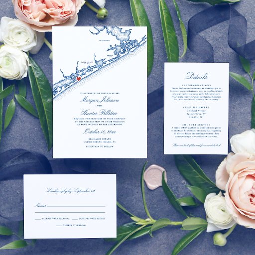 Welcome guests to your coastal North Carolina celebration with this elegant navy blue North Topsail Beach map wedding weekend events card. The front features a warm welcome message, while the back includes a customizable weekend itinerary schedule for your destination wedding festivities. Perfect for celebrations at Topsail Manor, Sea Haven Estate, The Nook at Sneads Ferry, Coastal Events & Occasions, The Ocean’s Edge Restaurant & Event Center, or St. Regis Resort. Artwork by Coastal Map Designs.