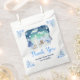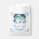 This cute and whimsical watercolor baby shower favor bag features a watercolor winter wonderland scene with adorable arctic animals, such as a polar bear, penguin, cat, owl, seal and a moose. In the background are the northern lights, snow capped mountains and trees. The text combines handwritten script and sans serif fonts for a stylish and modern look. Falling snowflakes and beautiful blue floral arrangements give a winter feel. This is perfect for winter and Christmas baby showers.