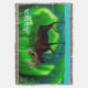 Ein immer leicht stilisiertes Bild eines Elchs, der gegen die Nordlichter silbrig geschmückt ist. Der Text "Alaska" erscheint in leuchtendem Blau und Weiß.
