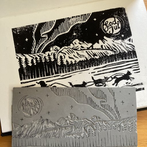 Teil eines Weihnachtslinodrucks des Weihnachtsmanns, der mit Hunden in der Arktis nachts mit Nordlichter und einem Sternchen oben einen Schlitten reitet, und "Frohe Weihnachten" auf Norwegisch auf dem Mond geschrieben.