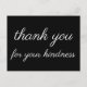 Dieses nostalgische, altmodische Dankeschön-Dir-Postcard-Design enthält die Meldung "Danke für Ihre Freundlichkeit" auf der Vorderseite, zusammen mit einer angepassten Nachricht auf der Rückseite. Es könnte verwendet werden, um zu bieten, dank jemandem, der etwas Schönes getan hat.